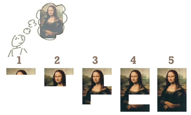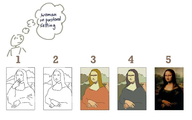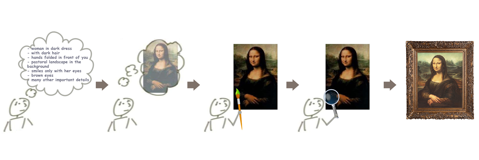 For example, a customer would like to receive a painting of a woman in a pastoral landscape. The performers start creating different versions of the client's requested painting with varying degrees of completeness. At each stage, they clarify with the customer whether the painting meets their requirements and make the necessary adjustments. This means that first the performers draw a sketch, then clarify how the client wants the woman in the painting to look, and then together with the customer choose the color scheme of the painting.