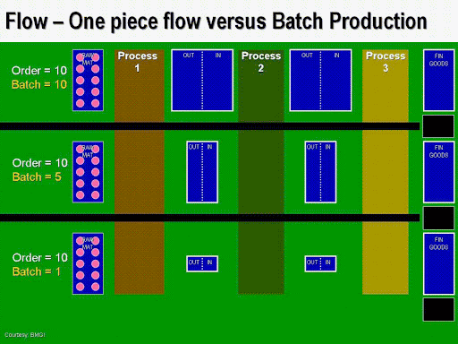 The bottom queue was assembled faster because work was done in small iterations, while the top queue was assembled twice as long as work was done in large batches of accumulated work. This is precisely the basis for the effect of faster development using an iterative-incremental methodology.
