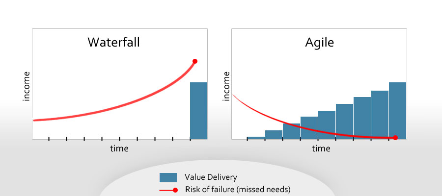 If we act in a waterfall way, then we get the final result at the very end, and the risk of failure (the probability of a negative outcome) increases over time - the closer the deadline, the higher the risk, as it is only possible to understand what the final result will be after full completion of development. That is, we only test the fully finished product after its development is completed, which means that the probability of detecting an error is much higher than if we tested the product in parts, as they become ready.