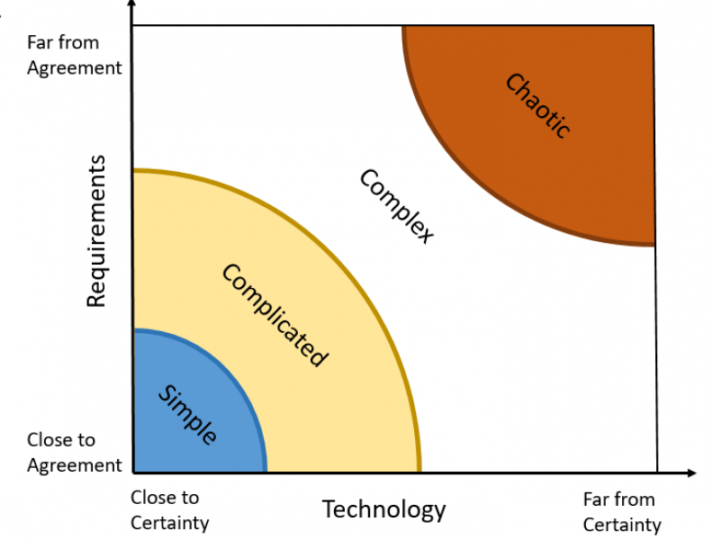 The first domain, Chaotic, is where vague requirements and new technologies exist. Success in this domain is practically impossible, with a probability close to zero.